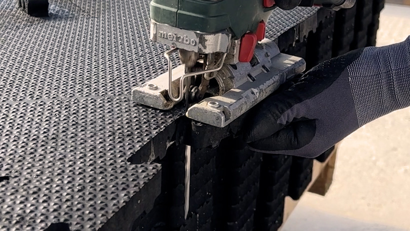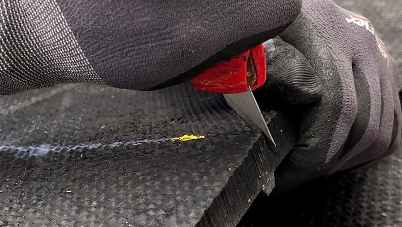 To ensure a clean and accurate cut, choose a cutter or a jigsaw, depending on the type of mat. Moisten the blade before cutting so it glides better. When cutting, bend the mat along the cut and pull it apart slightly. A wooden board can also be used (place a board underneath the mat before scoring and cutting it).