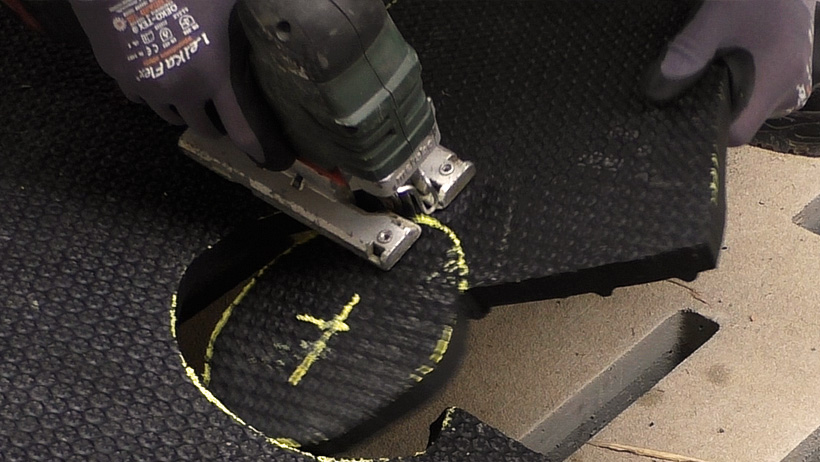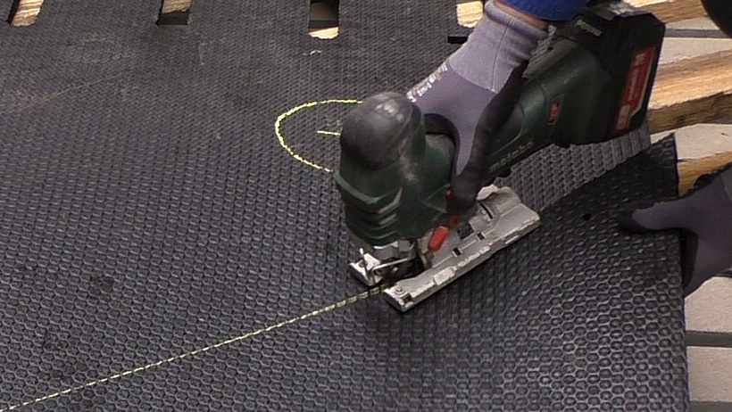 The rubber mats and connecting bars may need to be cut to size. They are anchored to the concrete floor with plugs. Standard equipment, such as a yard stick / tape measure and marking pens, is required for measuring and marking (tip: Yellow or white Edding 4000 deco marker).