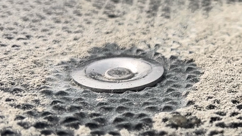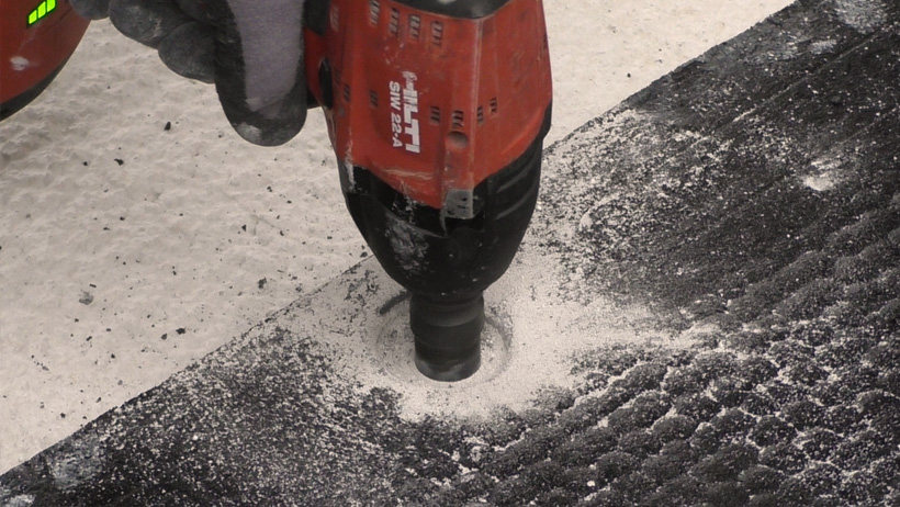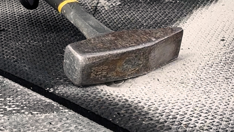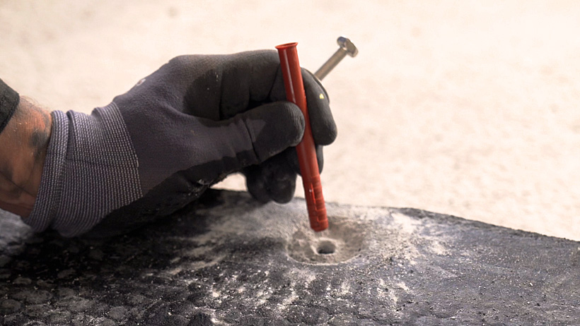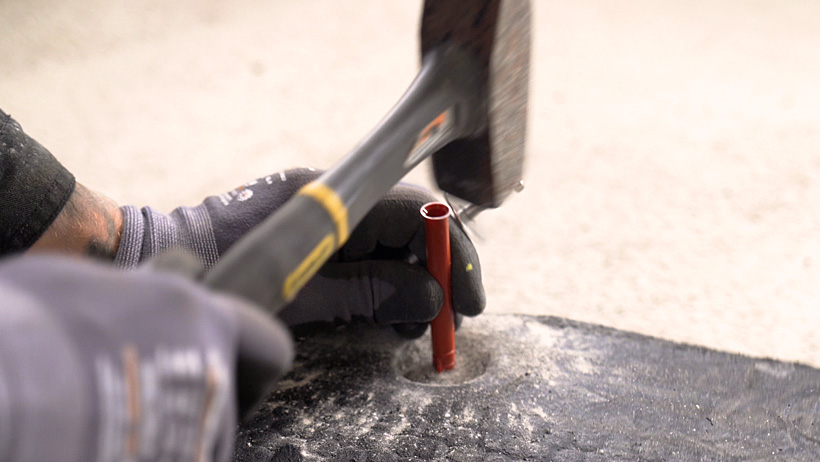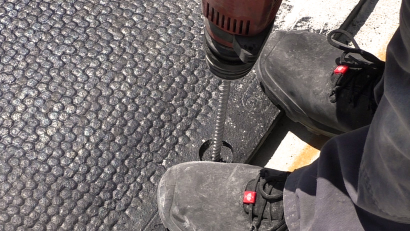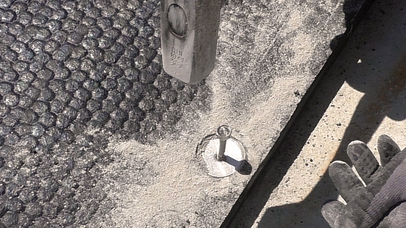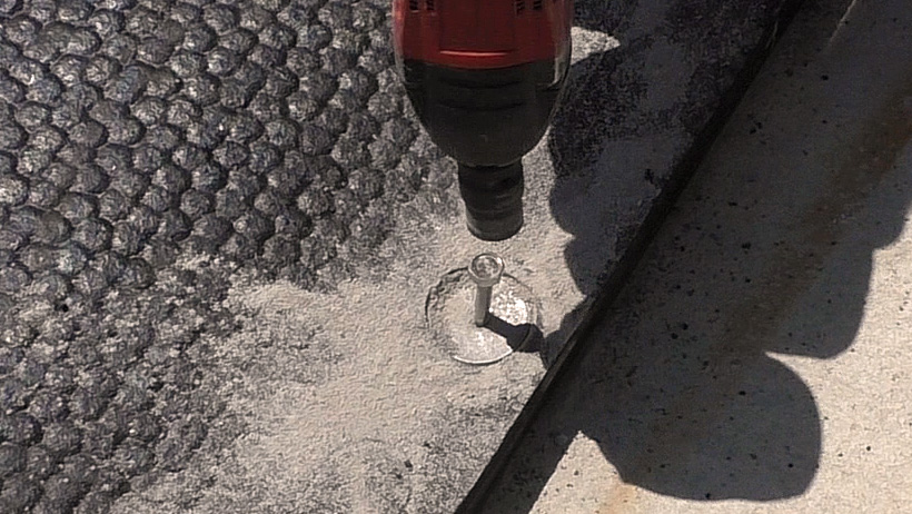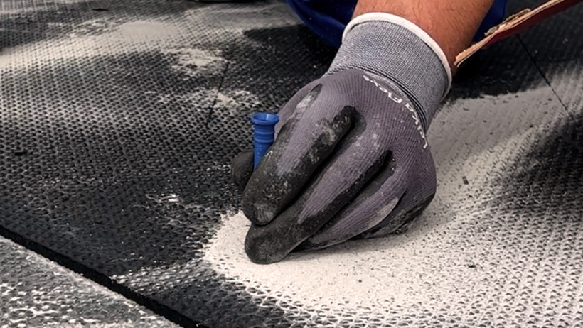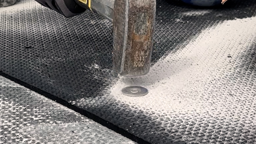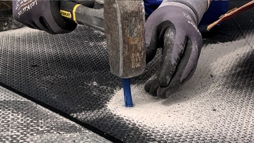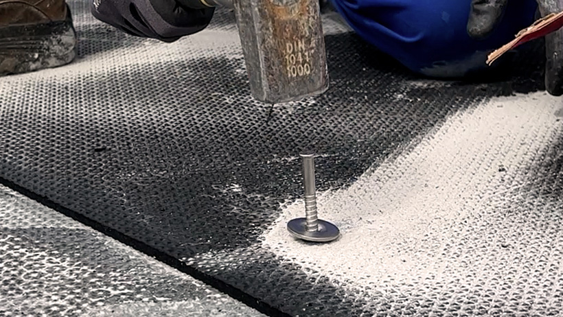 Important: Be sure to fix the mats evenly and firmly in place. Drive or screw in the nail plugs or screws just enough to allow the heads to be gently countersunk within the mat. Excessively inserted anchors can lead to potential stresses or bulges within the mat.